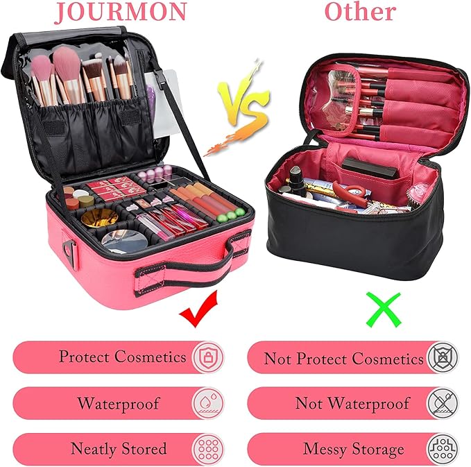 JOURMON Travel Makeup Bag Portable Cosmetic Case Organizer Portable Artist Storage Bag with Adjustable Dividers for Cosmetics Makeup Brushes Toiletry Jewelry Digital Accessories(Hot Rose,S)