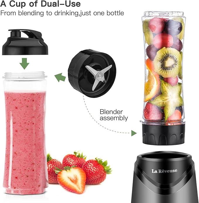La Reveuse Smoothie Blender Personal Size 300 Watts with 2 Pieces 18 oz BPA-Free Travel Sports Bottles,Grey