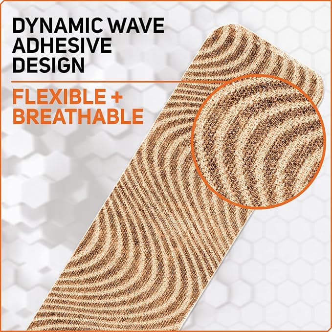 - PROVIDES COMFORT WITH BREATHABLE DESIGN - The athletic tape's dynamic wave adhesive design provides outstanding adhesion and breathability, allowing you to exercise and sweat without discomfort. It's made to boost performance, help with muscle strains, relax soft tissue, correct bad posture, and increase joint stability.