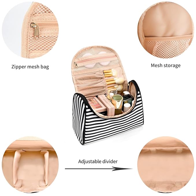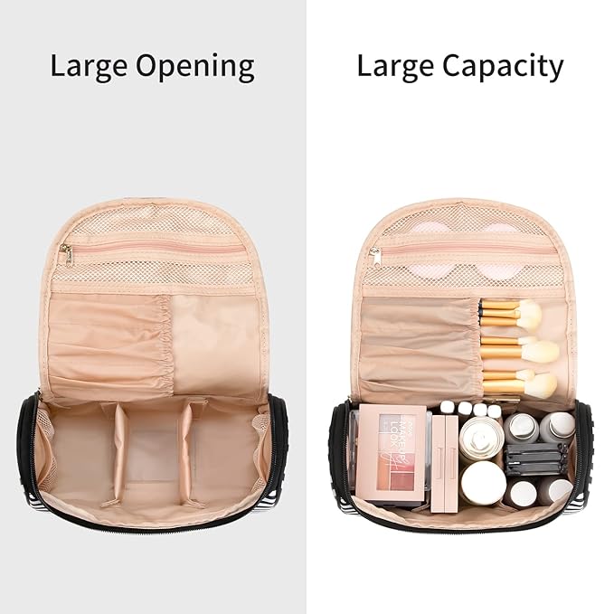 - 【Large Capacity】Make up bag size: 10 x 5 x 7.9 inch(L*W*H); 10 x 5 x 13.5 inch(Expand); Large opening zipper on top, make it easy to place your cosmetics, makeup brush and jewelry accessories, as well as shampoo, lotions, etc, and keep upright and neatly.