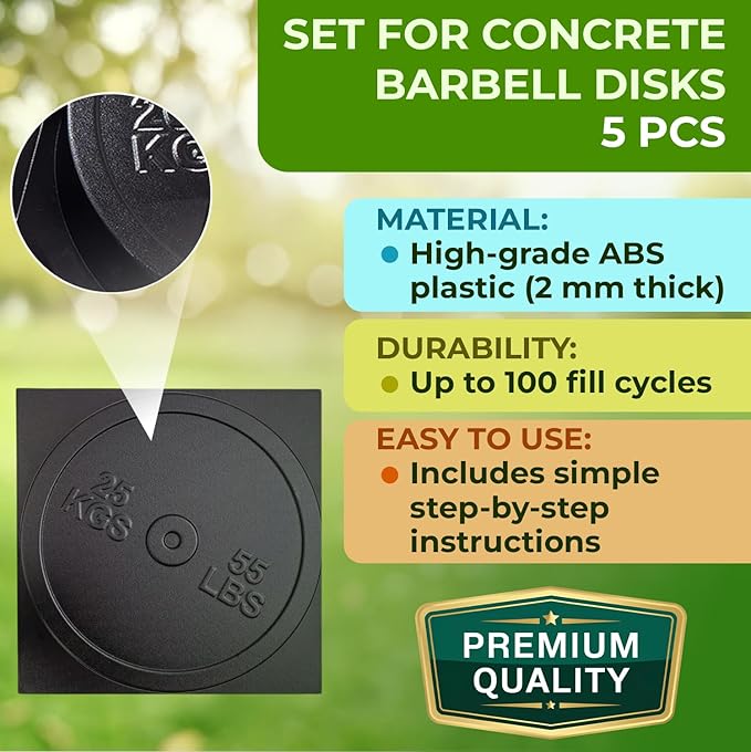 - 100% Quality Set of 5 DIY. Concrete Weight Plates Mold Set - Reusable molds for concrete, cement. - Easy to use! You can create a weight plate for your home gym.