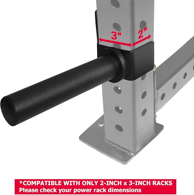- COMPATIBLE WITH ONLY 3-INCH x 2-INCH RACKS, 0.6” HOLE or LARGER HOLES AND 2” WEIGHT PLATE, BUT NOT ALL. Please note that this type does not compatible with both 2x2” and 3x3” power racks. (IT WOULD BE MUCH APPRECIATED IF YOU CHECK YOUR RACK DIMENSIONS BEFORE MAKE A PURCHASE SO AS TO PREVENT FROM UNCOMFORTABLE RETURNING PROCESS).