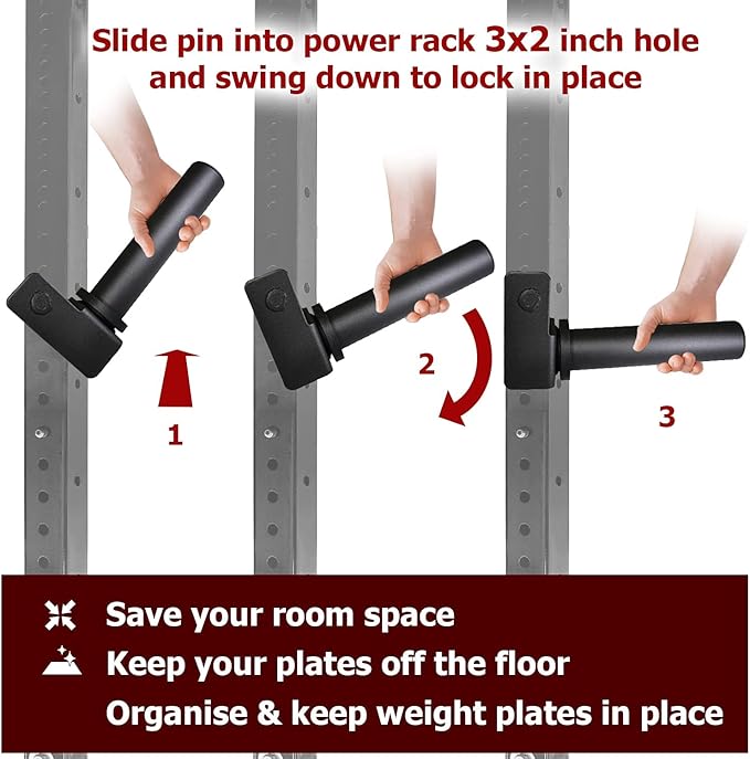 - EASY TO INSTALL AND USE: A2ZCare Weight Plate Holder can be easy to insert and lock-in design. Just slide pin into power rack's hole and swing down to lock in place. The design is especially ideal for loading and unloading the weight plates. Fit most of 3” x 2” square tubes rack and 0.6” hole or larger holes, but not all.