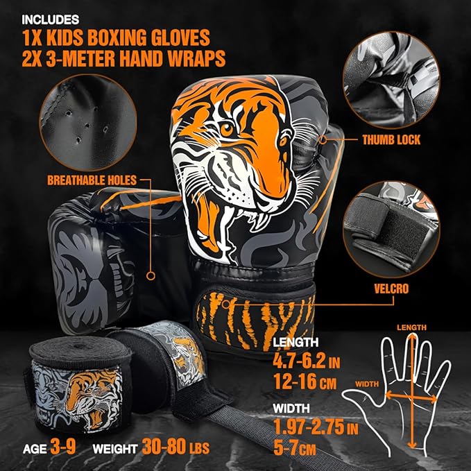 - Just Right for Your Size — This boxing gloves for kids from 30 to 90 lbs (or 14 - 40 kg). Ages 3 - 9 years old. Included 1x Kids boxing gloves, 2x 3-meter hand wraps.