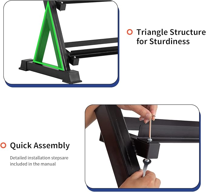 - 【Safe and Reliable Rubber Base】: 4 large-area rubber bases fully increase the contact area on the ground,ensure the stability of the product, and protect the floor from scratching. It also absorbs shock during re-stocking, preventing the dumbbell rack from sliding.