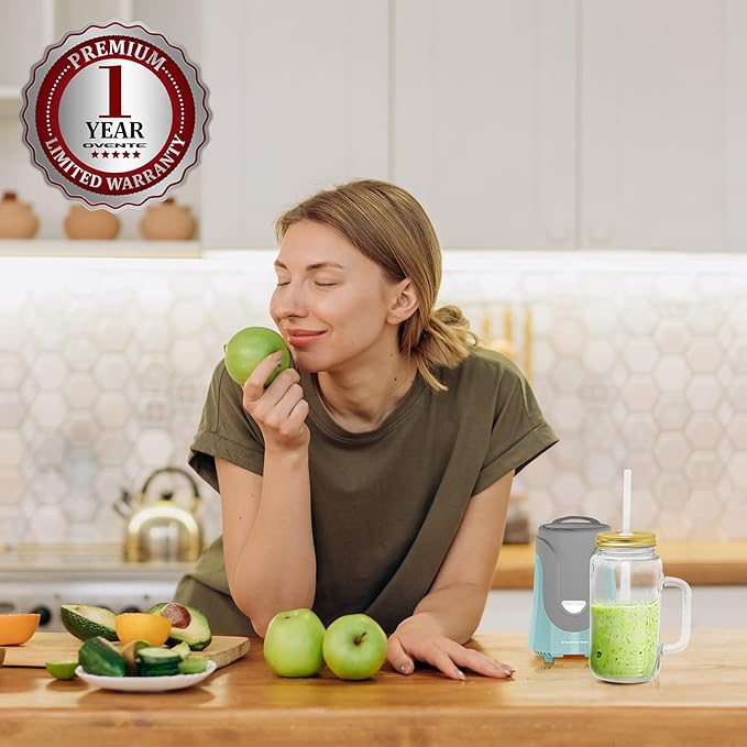 OVENTE Retro Personal Blender and Smoothie Maker with 18 Oz Mason Jar, 300W Base, Stainless Steel Blades, BPA-Free and Dishwasher Safe Container, Includes Reusable Straw and Lid, Turquoise BLH1002T
