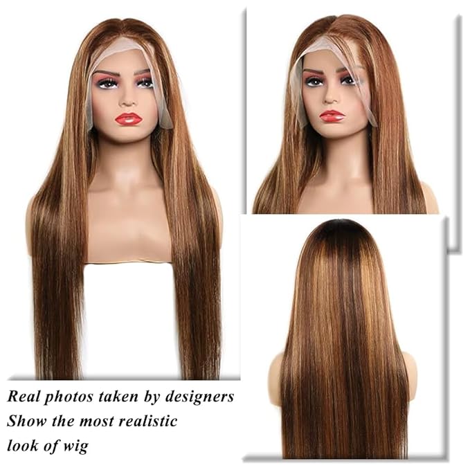 FABA Highlight Lace Front Wig Human Hair 32 Inch #4/27 Colored Lace Front Wig 13x4 HD Straight Human Hair 180% Density Ombre Brown with Human Hair Baby Hair