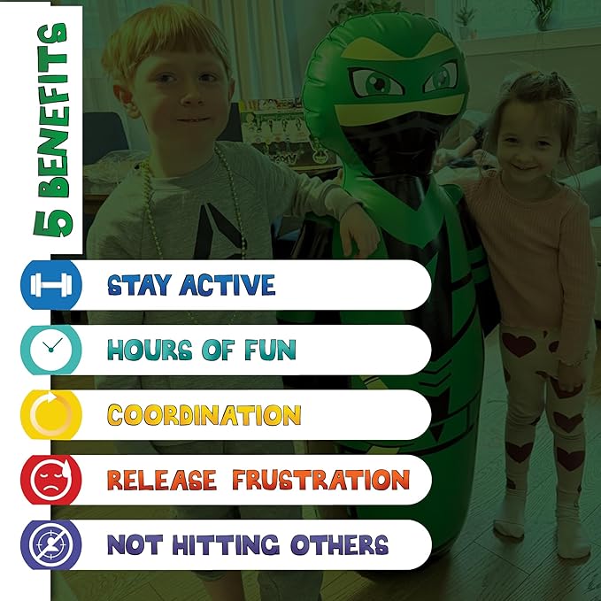 - Multifunction:With this punching bag, children can punch and kick for fun and imaginative play. Get your kids away from the television and video games for some action with our kids boxing bag! This inflatable is a standout choice among ninja kids toys, offering active fun for all occasions. Whether you're hosting a birthday or looking for ninja party supplies, this inflatable bopper brings energy to playtime. It's also a perfect addition to your collection of play therapy toys or karate fun.