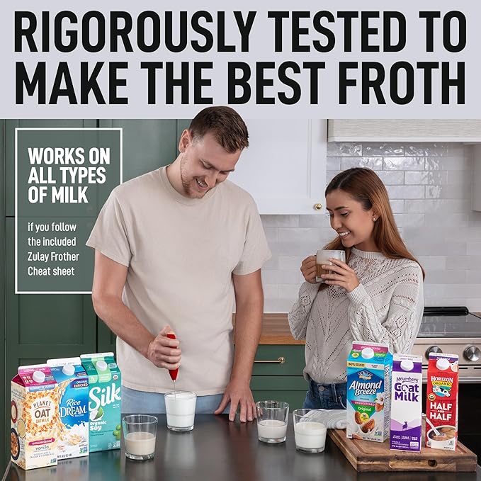 - Enjoy Proven and Trusted Quality: We use only premium materials. The construction will last, backed by our Zulay Guarantee to not rust or break, ever. Our small and efficient frother works on all types of milk - creamer, soy, almond, cashew, hazelnut, whole milk, and other dairy such as butter or cream.
