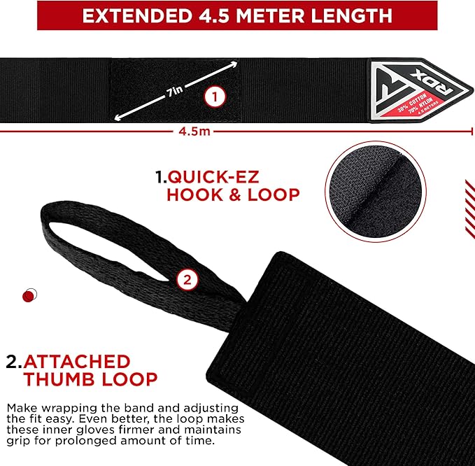 - HOOK AND LOOP CLOSURE AND ATTACHED THUMB LOOP – The hook-and-loop closure offers superior wrist support and a comfortable fit. Regulating the EZ wrist strap provides fine wrist sustenance and keeps your wrist aligned while striking. The attached thumb loop makes wrapping the band and adjusting it much easier. Even better, the loop makes these inner gloves firmer and maintains grip for prolonged training sessions