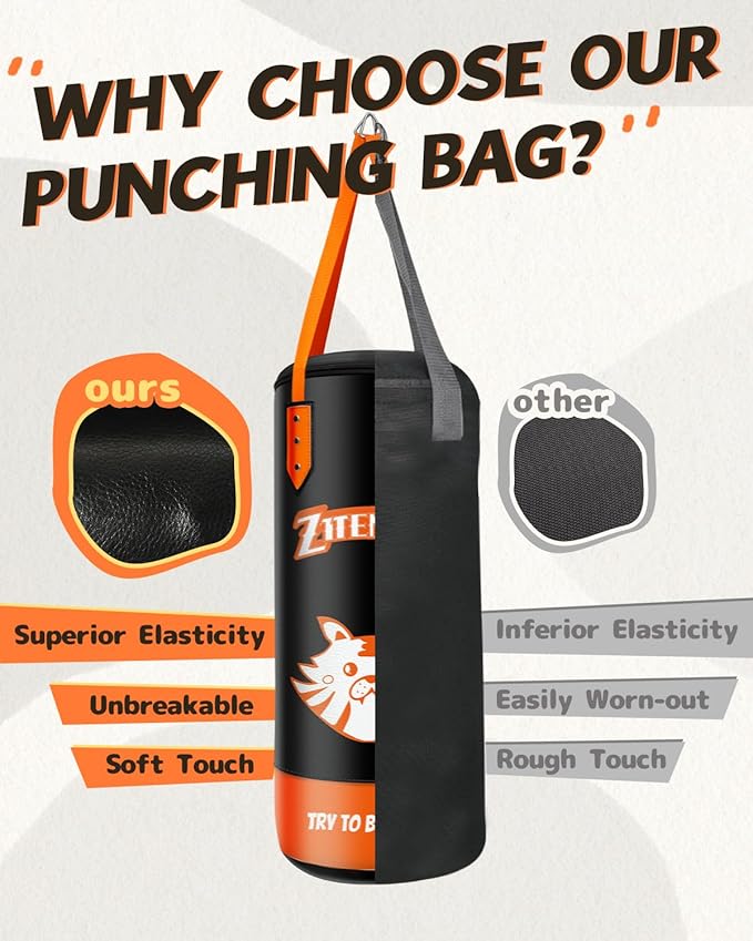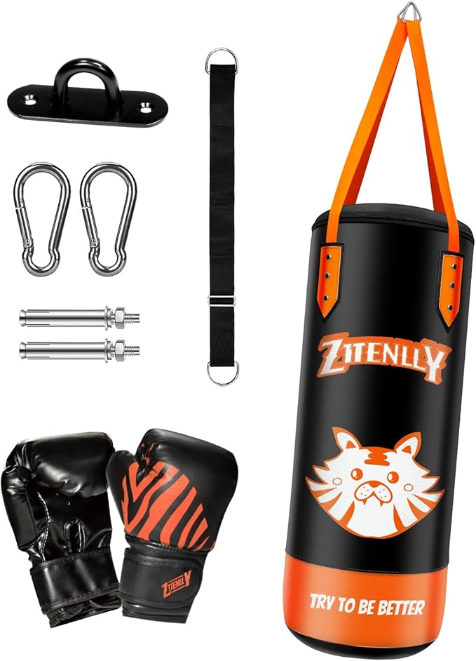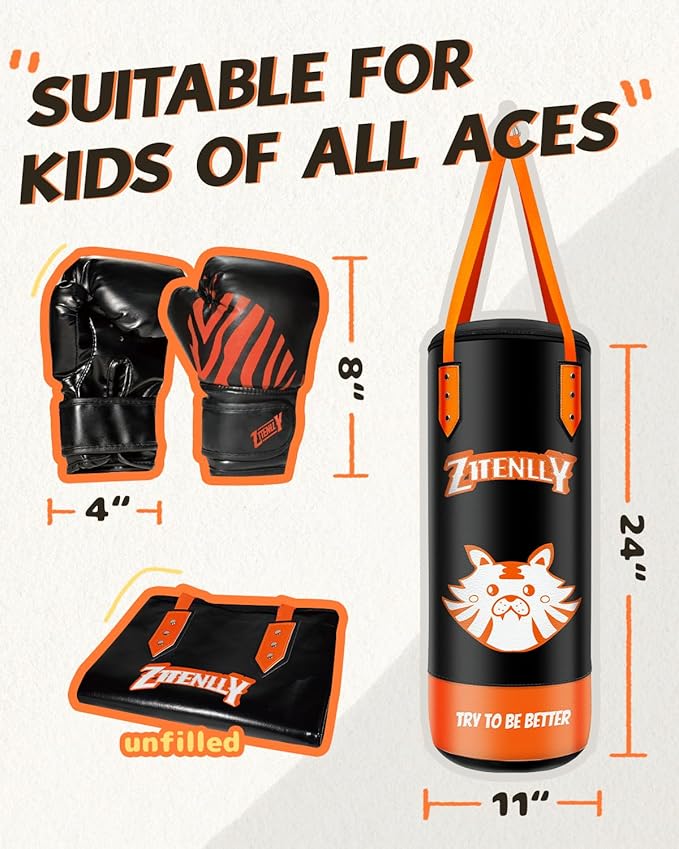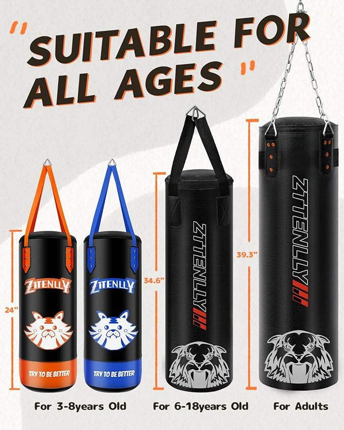 - PU DURABLE MATERIALS: ZTTENLLY kids punching bag is 2F high. It is made of high-quality PU leather, which is superior to traditional Oxford fabric and can withstand blows well over time. 6 oz PU leather gloves give optimum shock-absorbing protection for kids.