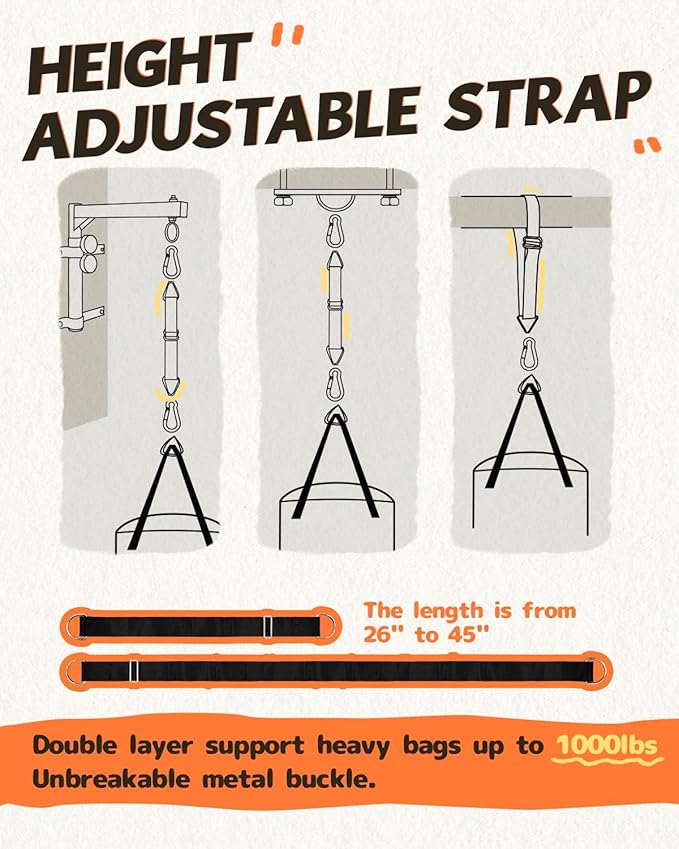 - EASY TO USE: Our punching bag kit is easy to install and includes everything you need for any boxing scene. The adjustable strap is for your convenience and can be adjusted from 26" to 45", fitting everyone's needs easily.