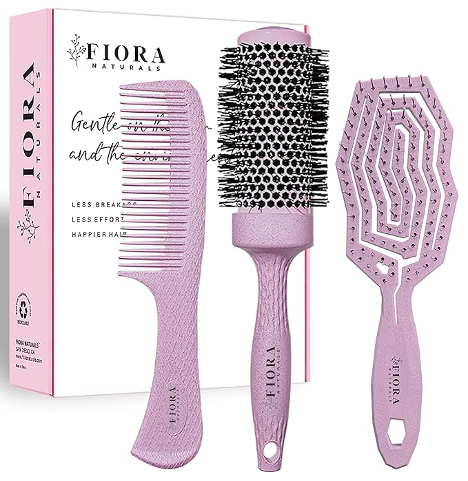 Fiora Naturals Bio-friendly Hair Detangler, Round Brush, and Comb Set for Women - All Hair Types: Natural, Fine & Curly - Ideal for Detangling and Blow Drying