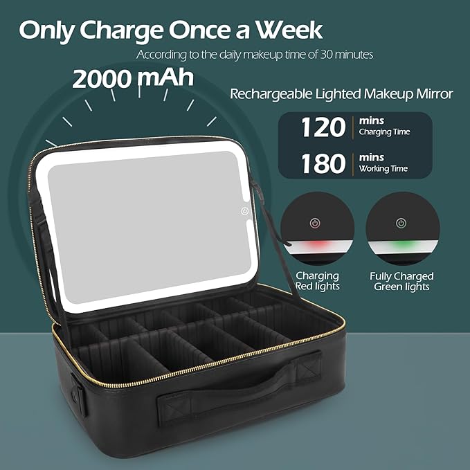 - 💡【Professional 3 Color Fill Lights with 4K Makeup Mirror】Cosmetic case includes an 13.5*9.25in full-screen light mirror.Long press the switch can adjust light brightness from 0% to 100%, and gently touching the switch can easily adjust color temperature between cold light, natural light, and warm light, making your face reflect skin condition and facial details Whether you are painting sophisticated party makeup, commuting makeup, or daily makeup.