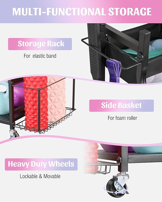 - HEAVY DUTY WHEELS: This yoga storage cart comes with 4 strong 360-degree wheels (2 lockable) and can easy to roll indoor and outdoor.
