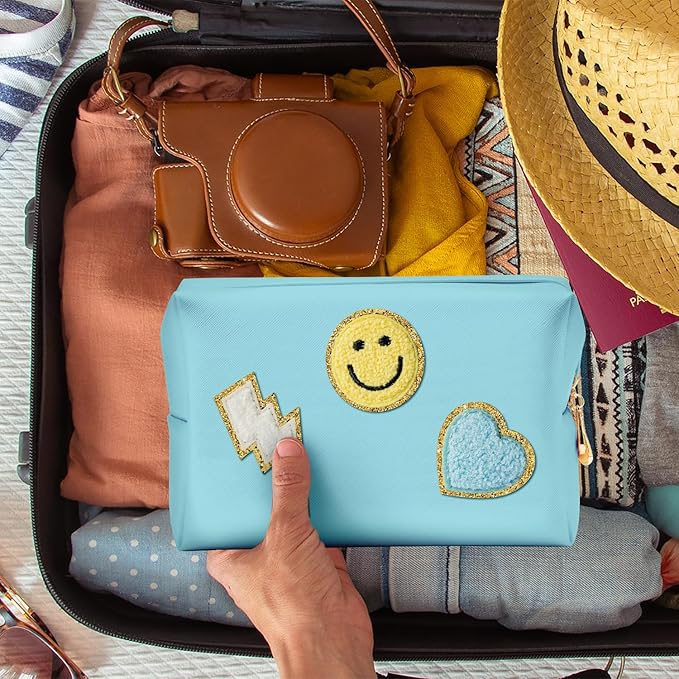 LieToi Preppy Patch Cosmetic Toiletry Bag, PU Leather Portable Waterproof Makeup Bag Smile Lightning Heart Organizer Compliant Bag Daily Travel Use Storage Purse for Women Girls (Large, Canal Blue)