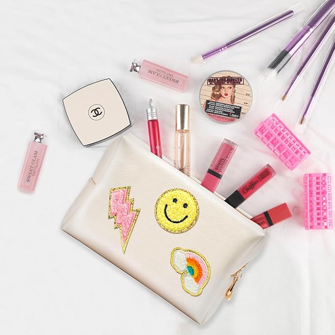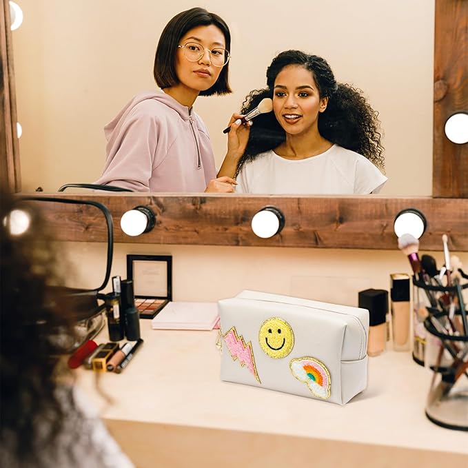 LieToi Preppy Patch Cosmetic Toiletry Bag, PU Leather Portable Waterproof Makeup Bag Smile Lightning Rainbow Organizer Compliant Bag Daily Travel Use Storage Purse for Women Girls (Large, Shell White)
