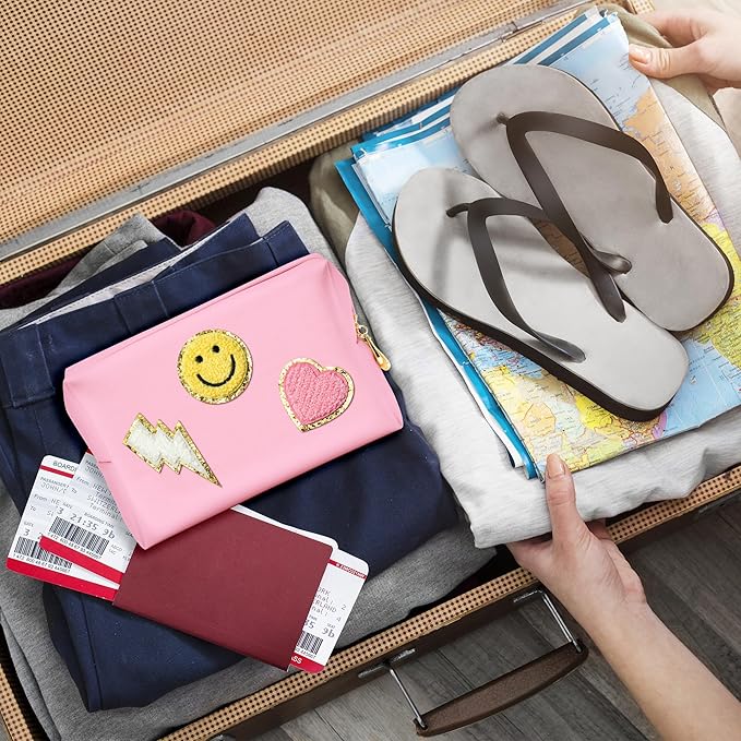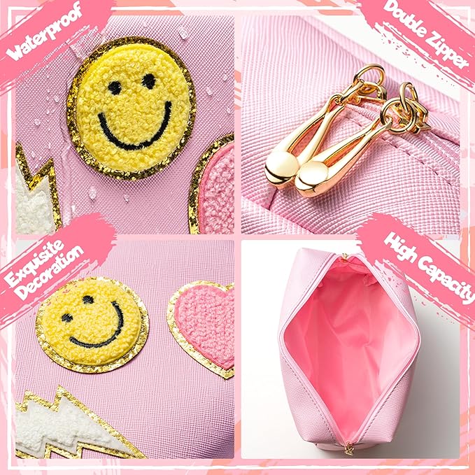 LieToi Preppy Patch Cosmetic Toiletry Bag, PU Leather Portable Waterproof Makeup Bag Smile Lightning Heart Organizer Compliant Bag Daily Travel Use Storage Purse for Women Girls (Large, Pink)