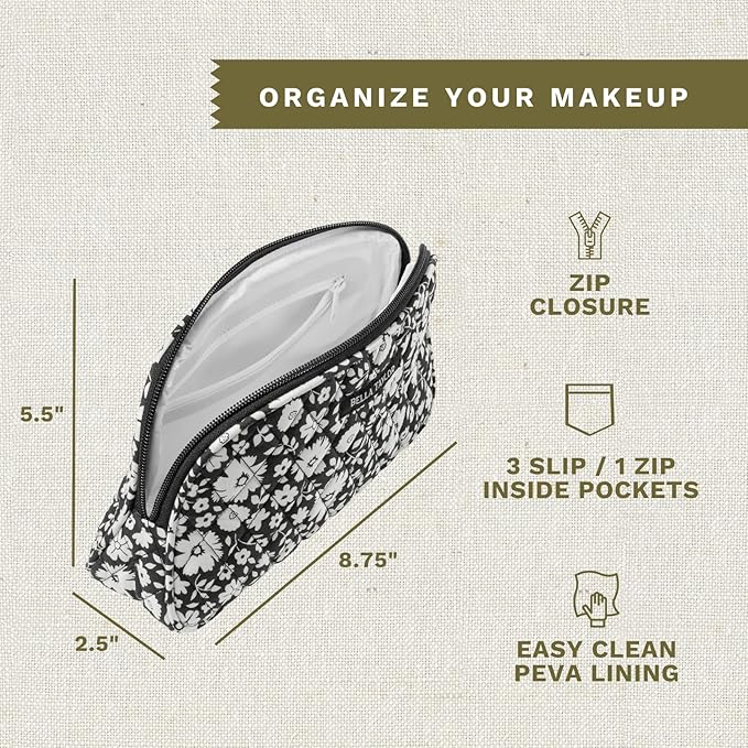 - Large Cosmetic Bag: At 8.75" wide, 5.5" high, and 2.5" deep, this travel makeup pouch holds all of your must-have beauty items for portable makeovers and quick touch ups. Closes with a zipper to keep your cosmetics secure.