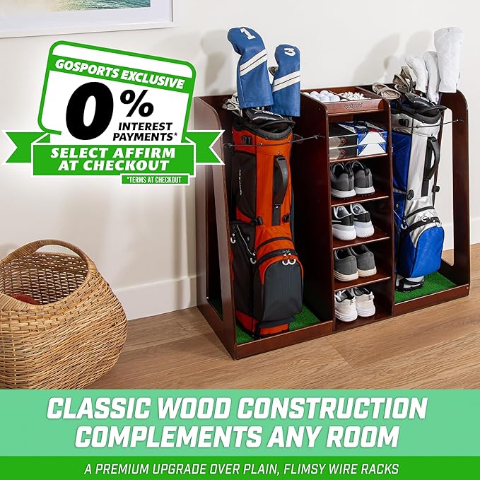 GoSports Premium Wooden Golf Bag Organizer and Storage Rack - Black, White or Brown Finish - Holds 2 Golf Bags