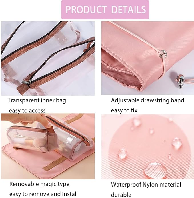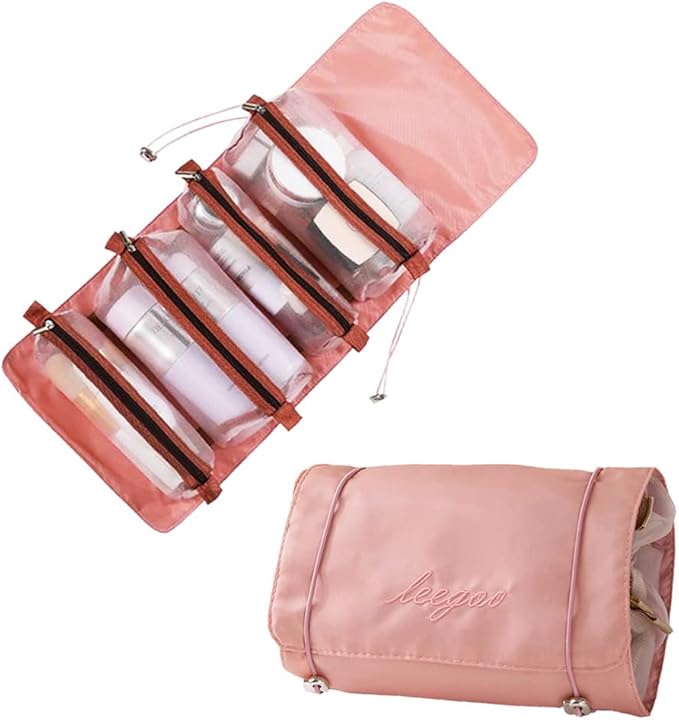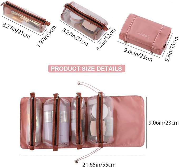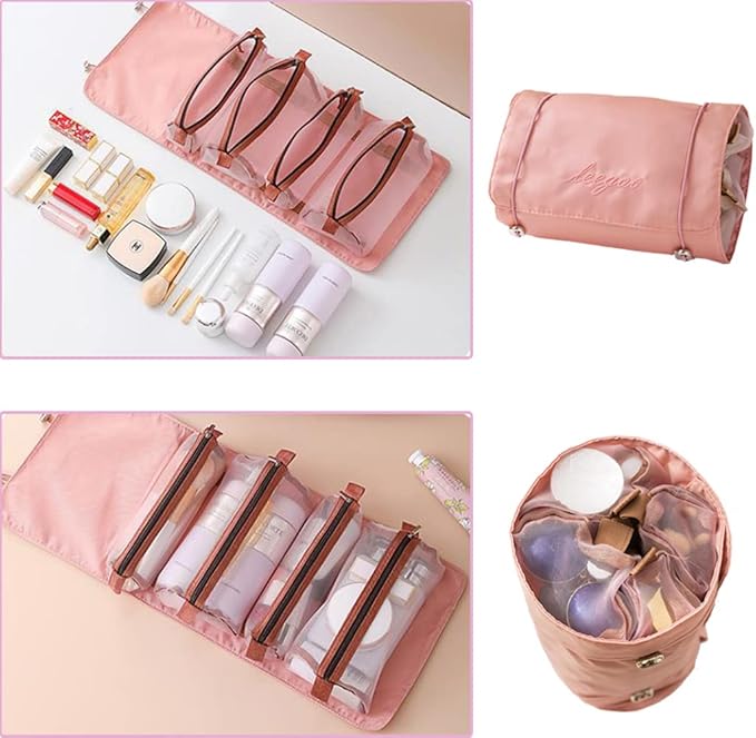 Roll Up Makeup Bag, Hanging Toiletry Bag, 4 in 1 Detachable Cosmetic Bag, 4 Removable Storage Bags, Travel Makeup Organizer Bags for Women Men(Pink)