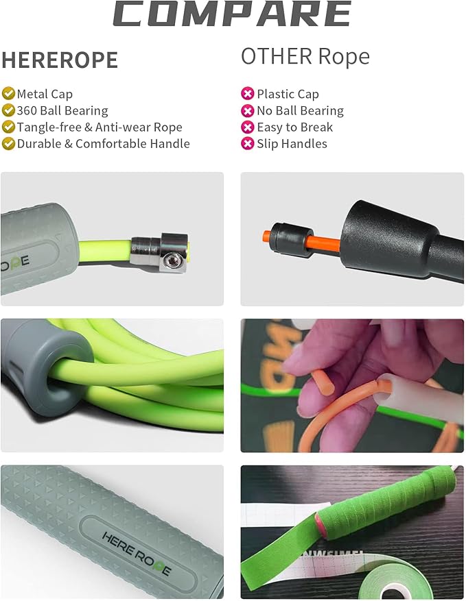 - SUPERIOR CONTROL HANDLES. The handles are ergonomically & no-slip designed to fit in your hand perfectly with an outer thick rubberized layer, finished with raised triangle pattern to optimize grip & control. From basic jumps to different jumprope skills, Hererope can handle it all!