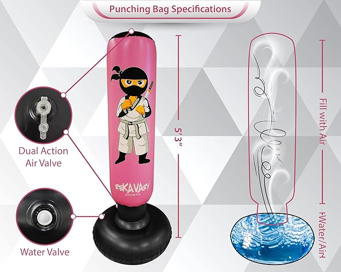 - 100% High Quality, Non-Toxic and Durable material. Kids inflatable punching bag with stand is made of extra thick, high quality, non-toxic pvc material. Each ninja toys free standing punching bag is quality tested and ensured. Rekavary sports ninja inflatable kids punching bags will stand the test of continuous kicking and punching from your kids. Boxing gloves included for an all inclusive punching boxing bag kit with ninja kids punching dummy and pump included.