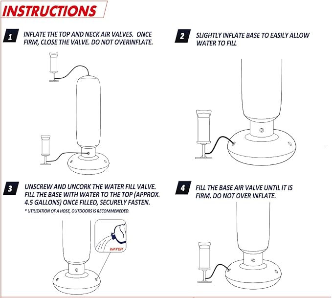 - East set up - simply fill each respective air valve on the free standing punching bag with the included double air pump and fill in the base with water.