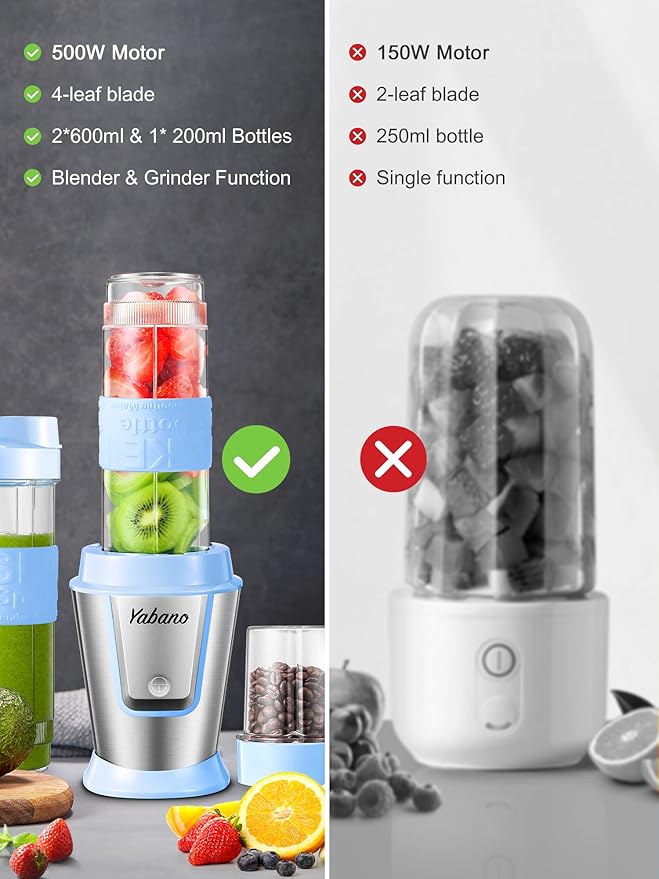 - POWERFUL SINGLE SERVE BLENDER - 500W motor delivers instant smoothies in one serving. Perfect for busy lifestyles who need quick, protein-packed drinks on the go.