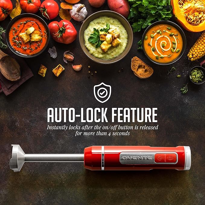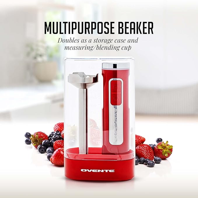 OVENTE Cordless Immersion Hand Blender, Rechargeable Handheld Portable Stick Mixer with 8 Mixing Speed Option, One-Touch Control and Stainless Steel Blades for Smoothies, Shakes or Soups, Red HR781R