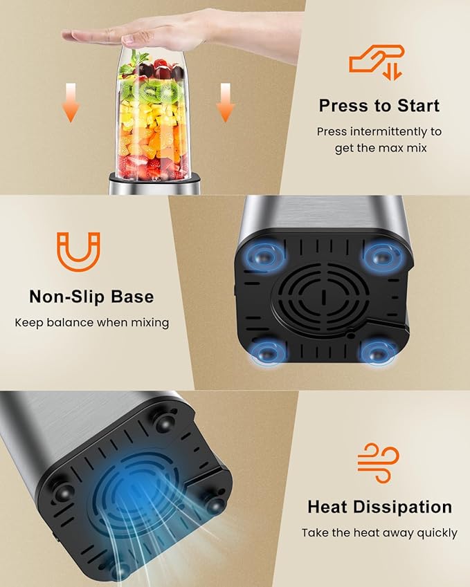 - Intermittent Press Operation: The blenders for kitchen adopts powerful pulse technology, which triggers the motor to rotate at high speed when pressed, with a max rotating speed of 25000 rpm, making the perfect drink within 10-20 seconds. Simply press and hold the smoothie blender's cup and immerse in the stirring process.