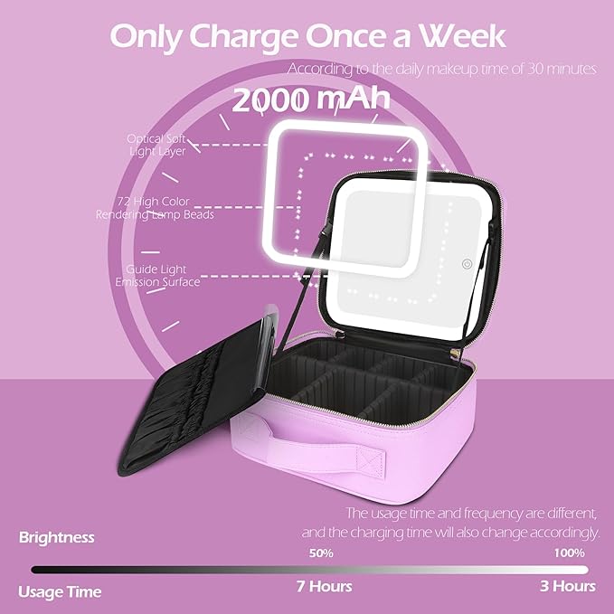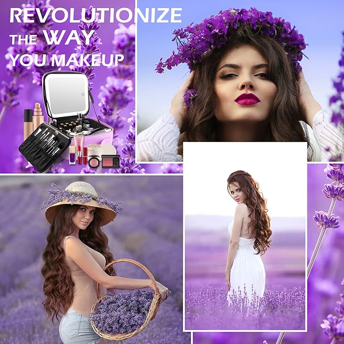 MOMIRA Makeup Bag with Mirror and Light Travel Makeup Train Case Cosmetic Bag Organizer Portable Artist Storage Bag with Adjustable Dividers Makeup Brushes Storage Organizer Purple