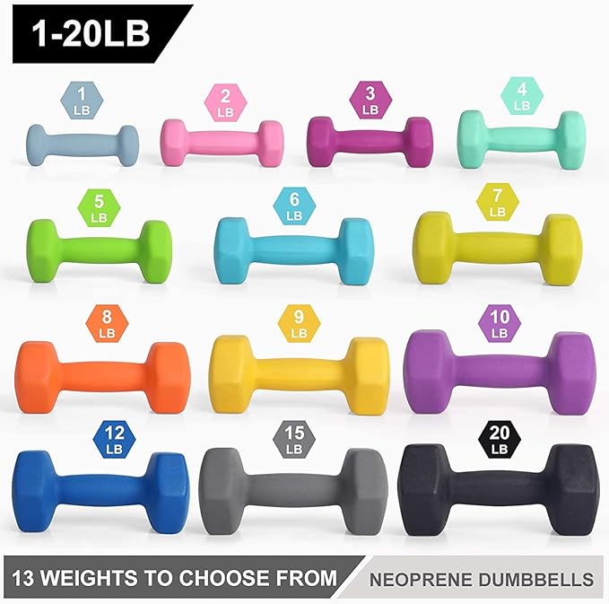 - Choose from 13 Different Sizes:LIONSCOOL neoprene coated dumbbell weights are sold in pairs and available in 1, 2, 3, 4, 5, 6, 7, 8, 9,10,12, 15 and 20 pounds, which allow you vary the intensity of your workouts. Each Dumbbell is color coded with clear printed weight number on the end caps for easy and quick identification.