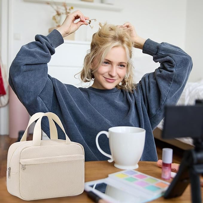 - 【Perfect size & Portable 】L*W*H:9.8*3.55*7 (inch) .Small size and large capacity design, make this cream corduroy cosmetic bag hold all your makeup items,like make-up base, powder, lipsticks, etc. And the makeup bags for women is easy and flexible to pack in your luggage.