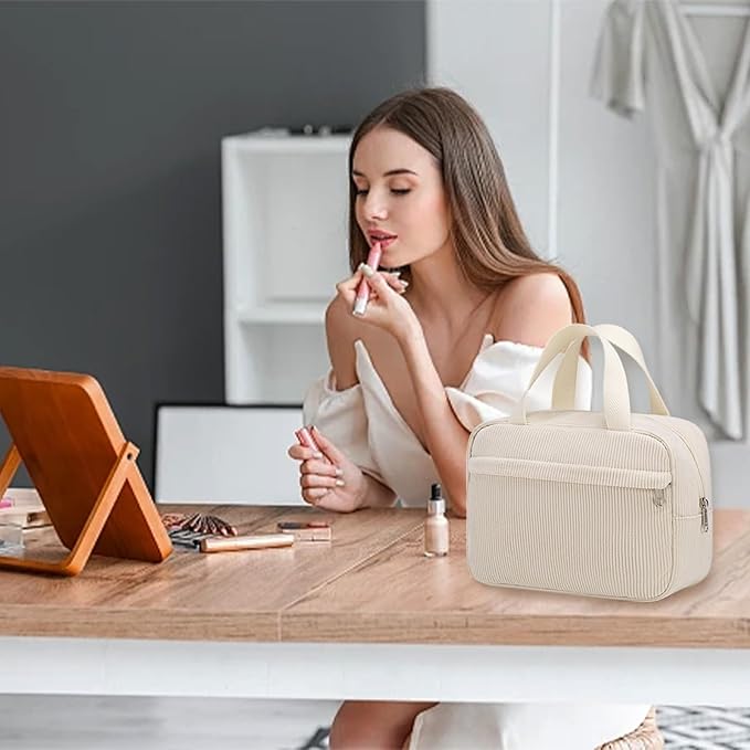 - 【Roomy space】The beige travel corduroy makeup tote bag has 1 main pocket, you can put your cleanser, lotion in the large makeup bag. 1 internal side pocket can put your makeup brush. 2 internal mesh pocket, you can put some small items, such as eye shadows, etc. There are also 1 external pocket, you can put your private items, mobile phones, chargers, etc.