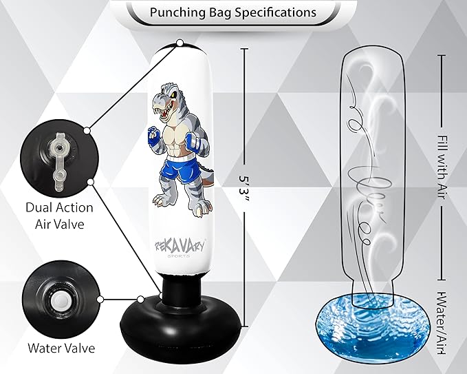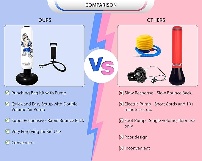 - Double Action 2X capacity Air Pump included - Inflate the kids ninja punching bag in half the time with ease. The included Dual Action Super Air Pump makes inflating fast, easy and simple in under 60 seconds. Dual Action hand pump easily inflates the inflatable punching bag on both the up and down pump unlike the issue prone electric pumps that are hindered by their short cords, the need to be near an outlet, the lack of power outlets where you need them making electric air pumps inefficient.