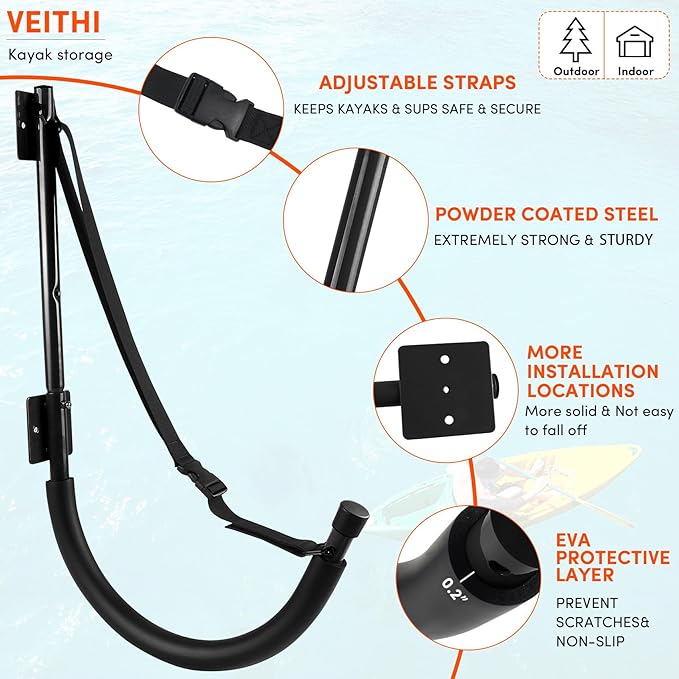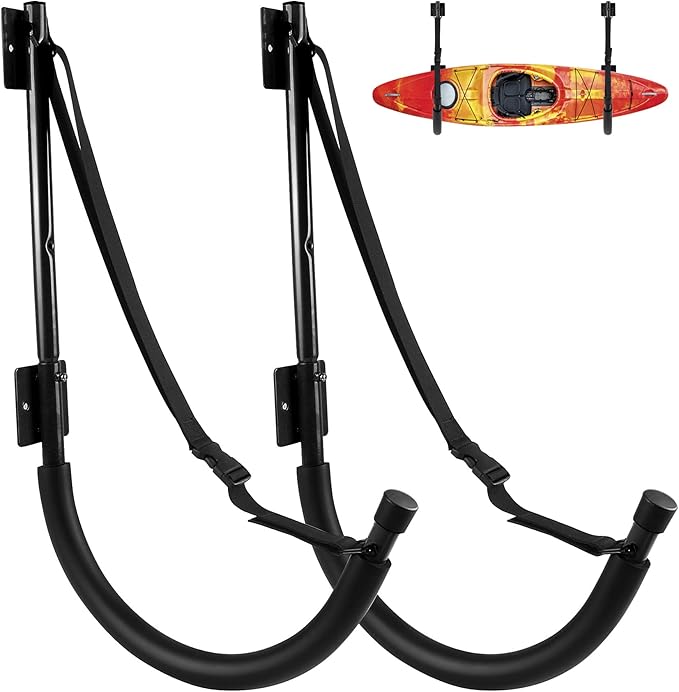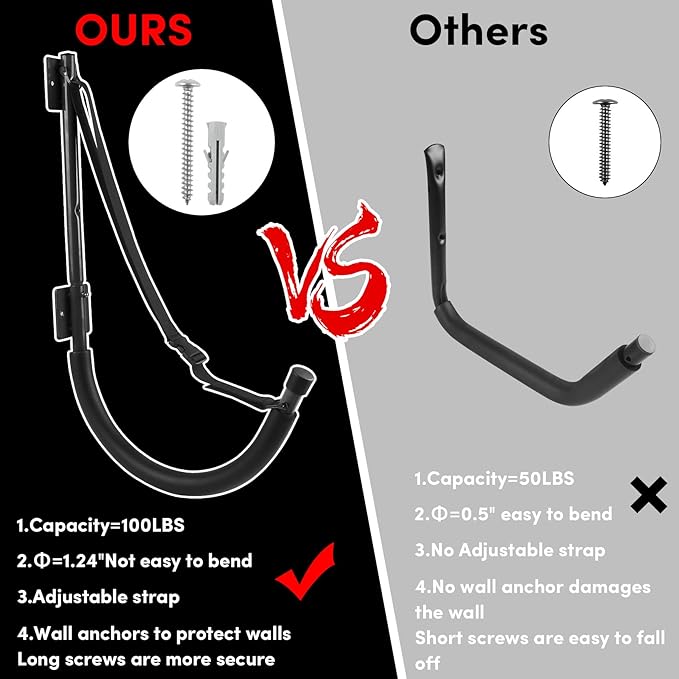 - 【Kayak Wall Mount Material】The kayak wall rack is made of sturdy heavy duty powder coated steel - double protection,no bending, lightweight yet super strong,rust-proof and corrosion-resistant.The kayak hooks is a solid tubular steel construction,sturdy and long-lasting use.kayak wall storage rack can safely withstand 100 lbs when properly installed.