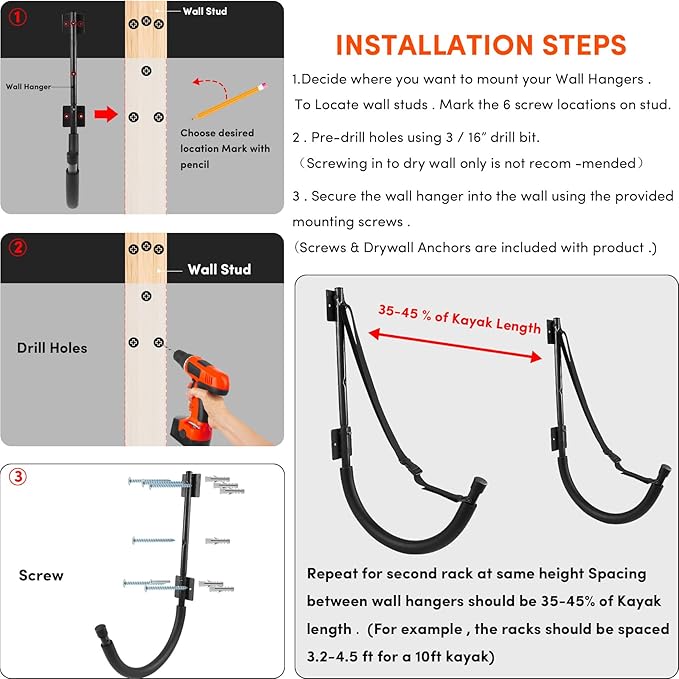 - 【Kayak Wall Mount Rack Easy to Install】Installing kayak wall storage is a simple process. Drill a hole where you marked. Make sure you drill the hole deeper than the length of the anchor. Then, insert the kayak storage hangers drywall anchors into the holes. Finally, use a screwdriver to tighten the bolts.The kayak storage hook is very simple to install, and even a novice can quickly install it.