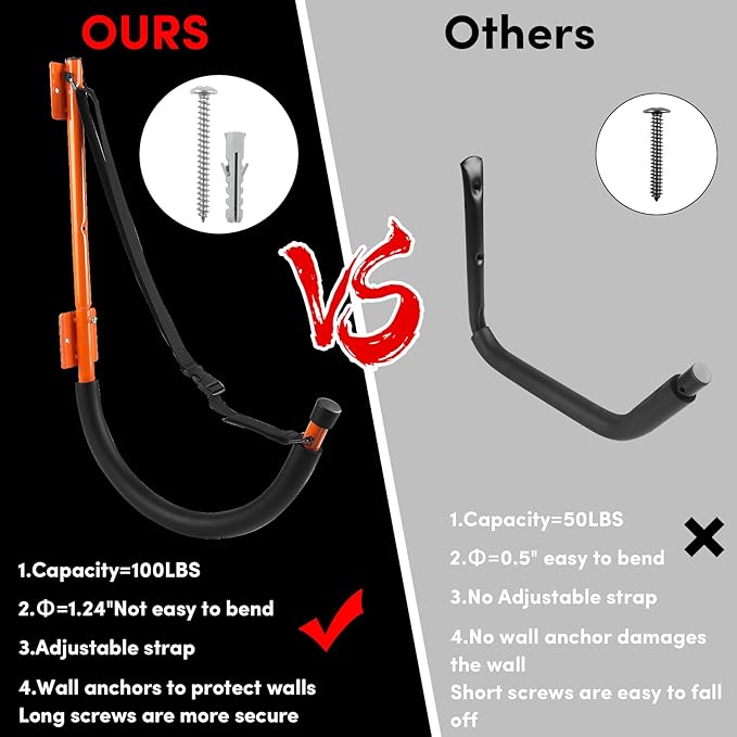 • 【Kayak Wall Mount Material】The kayak wall rack is made of sturdy heavy duty powder coated steel - double protection,no bending, lightweight yet super strong,rust-proof and corrosion-resistant.The kayak hooks is a solid tubular steel construction,sturdy and long-lasting use.kayak wall storage rack can safely withstand 100 lbs when properly installed.