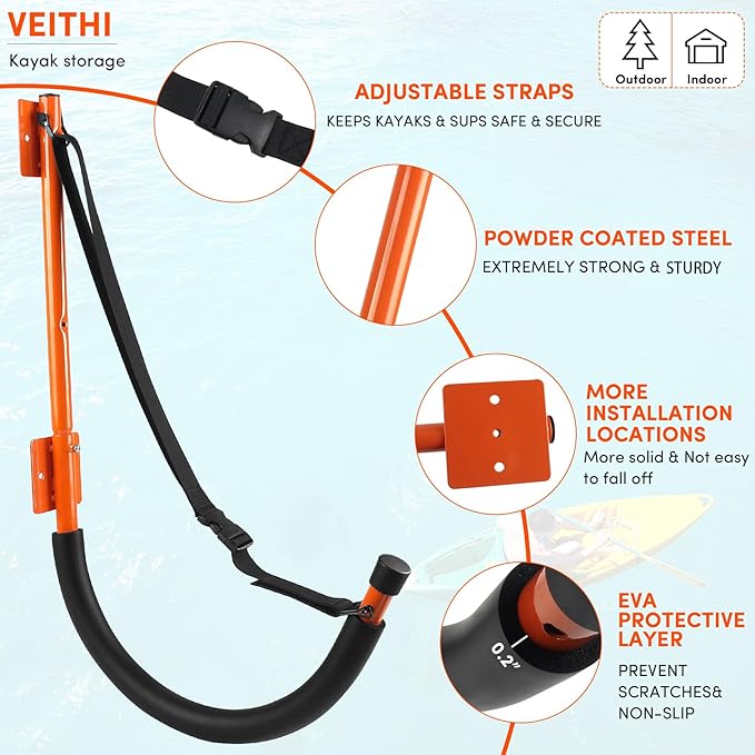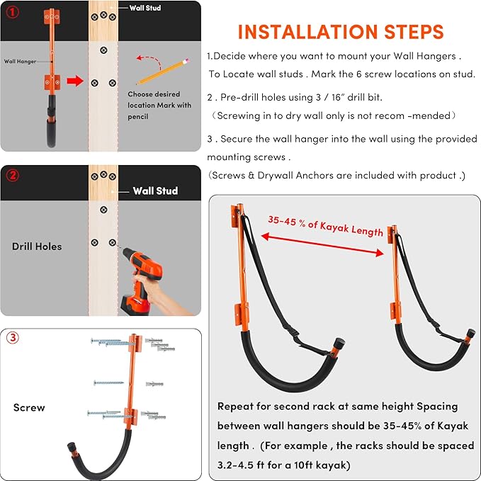 • 【Space-saving Kayak Wall Mount Storage】 The package includes 2 kayak rack storage, 14 screws and 12 anchors, the updated screws are longer and stronger . Kayak wall mount hooks Suitable for indoor or outdoor use in the garage, shop or home. Kayak hanging rack fit neatly on drywall, wall studs, and other wall types, freeing up space on the ground.
