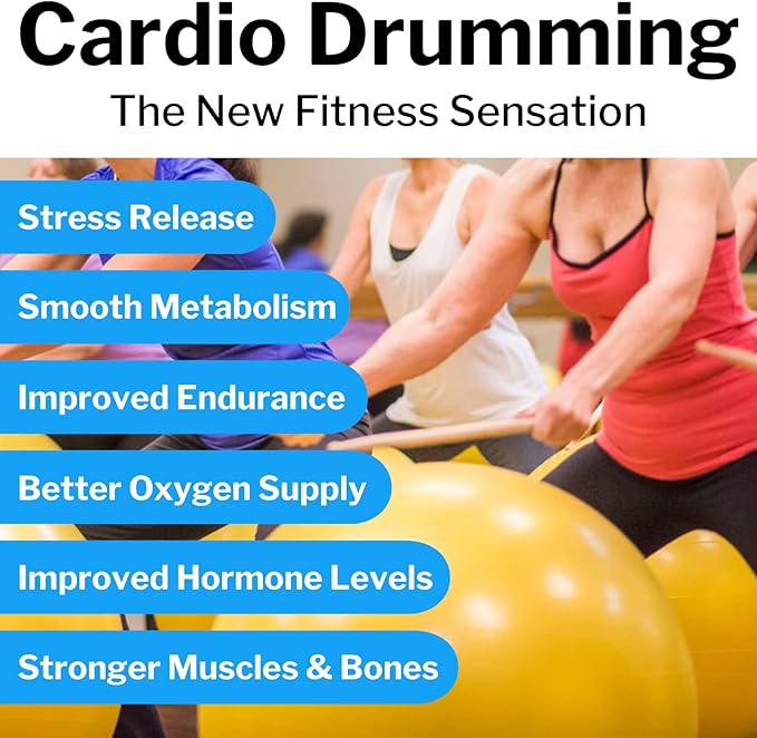 - LEVEL UP YOUR WORKOUTS - Each cardio drumming equipment set comes with 2 wooden weighted drum sticks that are 16 inches long and weigh 3.2 ounces along with a 65cm exercise ball with pump to help you add cardio drumming and aerobic fitness into your workout routine.
