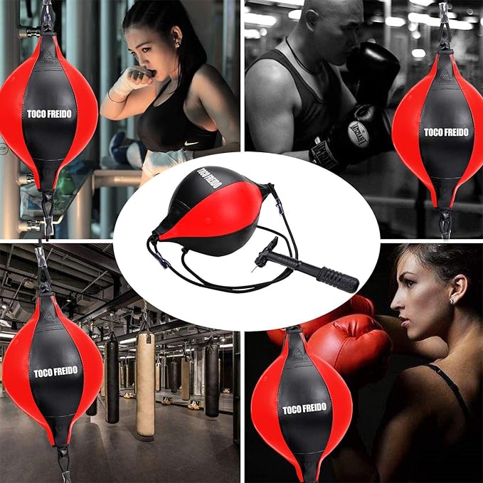 - 【PREMIUM DOUBLE END PUNCHING BALL FOR YOUR GYM】TOCO FREIDO Speed Bag made of PU Cow hide leather material is lined inside with 4 layers of poly cotton material. Boxing ball adopting rubber thickened inner bladder, anti-leakage, double stitched and reinforced with triangle seams,tight gas nozzle design, inflatable convenience.