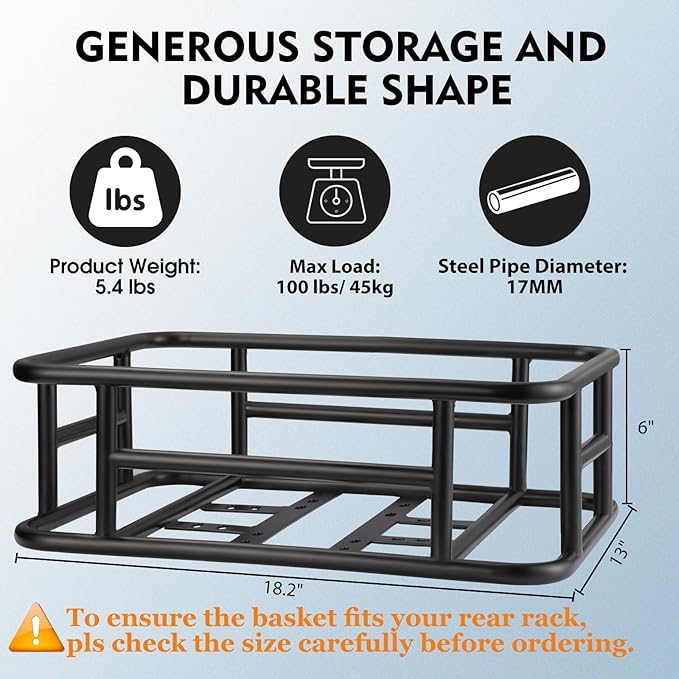 - ๐ฆ๐๐ฝ๐ฒ๐ฟ ๐๐ฎ๐ฟ๐ด๐ฒ ๐ฆ๐ฝ๐ฎ๐ฐ๐ฒ: The dimension of the basket is 18.2 x 13 x 6 inches, which can support a weight of 60lbs. Perfect for carrying backpacks๏ผpets๏ผdaily shopping, or as a delivery bike basket.