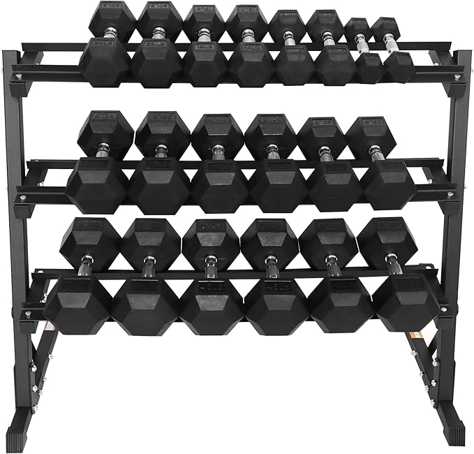 - 550 pounds set: 1x 3-tier rack, pair of 5lbs, 10lbs, 15lbs, 20lbs, 25lbs, 30lbs, 35lbs, 40lbs, 45lbs and 50lbs