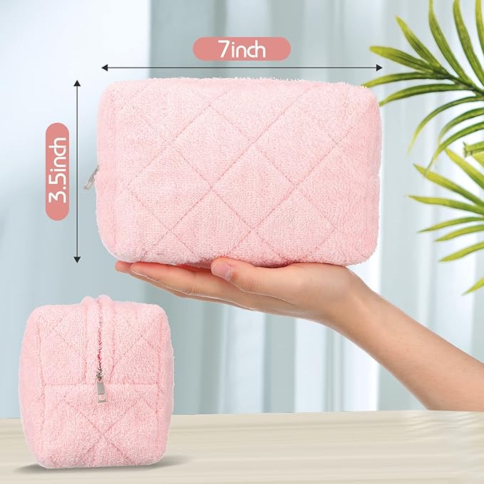 LEIFIDE 4 Pcs Quilted Makeup Bag Pouch Cute Plush Fuzzy Checkered Cosmetic Bag Cotton Terry Cloth Toiletry Pouch with Zipper Portable Travel Organizer Preppy Brush Storage for Christmas Women Gift