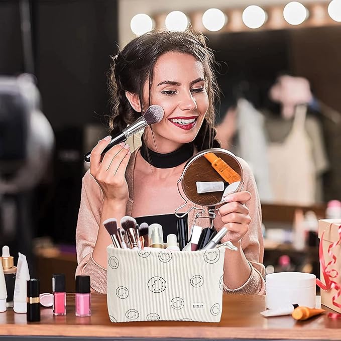 WLLWOO Makeup Bag-2pcs Smile Face Corduroy Cosmetic Bag Zipper Interior Waterproof Pencil Case Coin Purse Travel Toiletry Small Makeup Pouch For Women