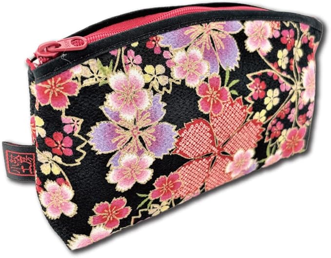 Terra Distribution Small Makeup Bag for Purse [ Made in Japan] Traditional Edo Komon Design Cute Cosmetic Pouch (Cherry Blossom (Black/Pink))