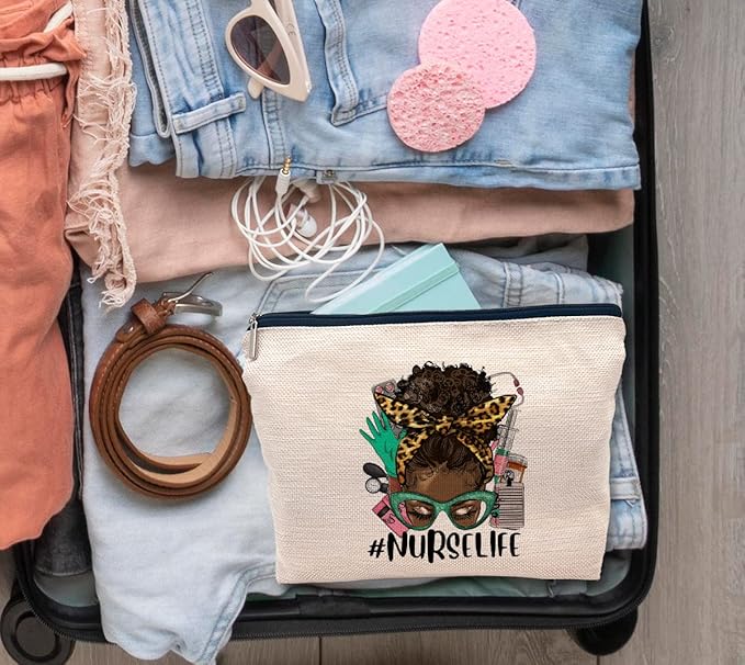 IWXYI Afro Messy Bun Nurse Life Cosmetic Bag For Women,Western Nurse Life Women's Makeup Bag Case Bags Zipper Pouch Travel Toiletry Gifts For Women Afro Nurse,Afro Nurse Gift,Nurses Day Gift