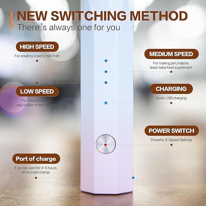 - 3 Speeds Adjustable Coffee Frother: 3 Gears allow you to choose different speeds to achieve ideal frother effect.Low speed for Mixing protein powder drinks. Middle speed for making matcha tea. High speed for creating creamy milk froth which can be used in coffee, latte, cappuccino, and drink.