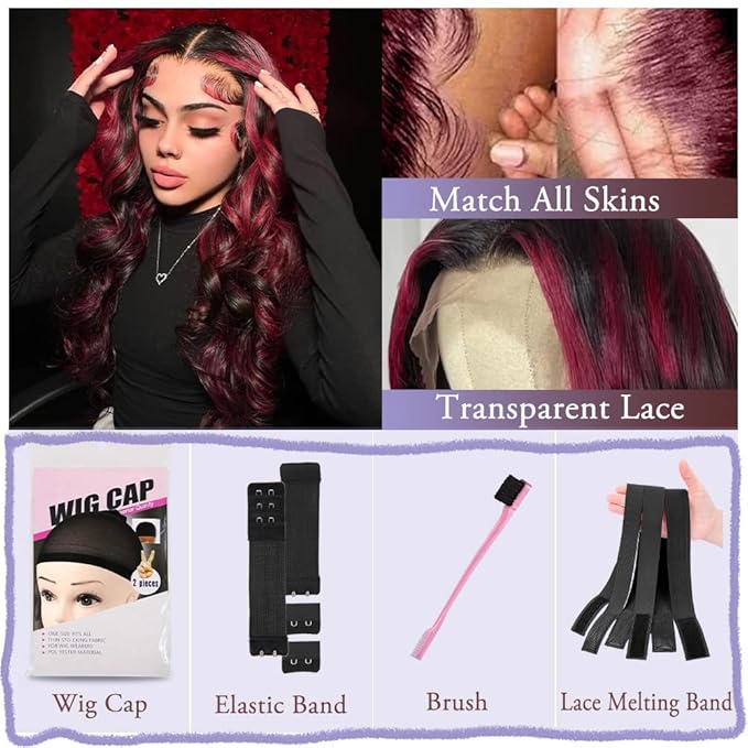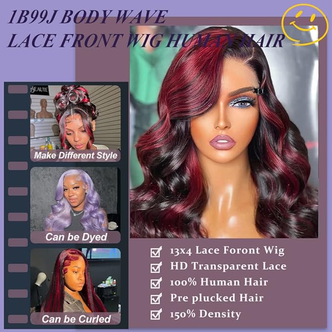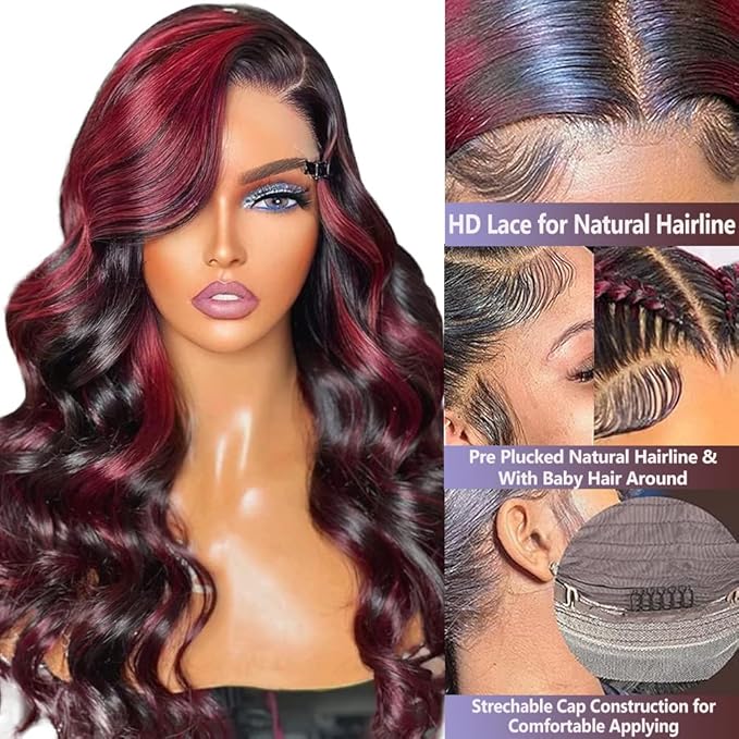 - Burgundy Highlights Lace Front Wig Human Hair Material: EXCELLENT! :13x4 Hd Transparent Swiss Lace, With Natural Baby Hair Line. Can Make Middle Part, Side Part Freely, Make High Ponytail And Buns.